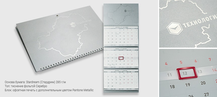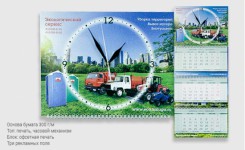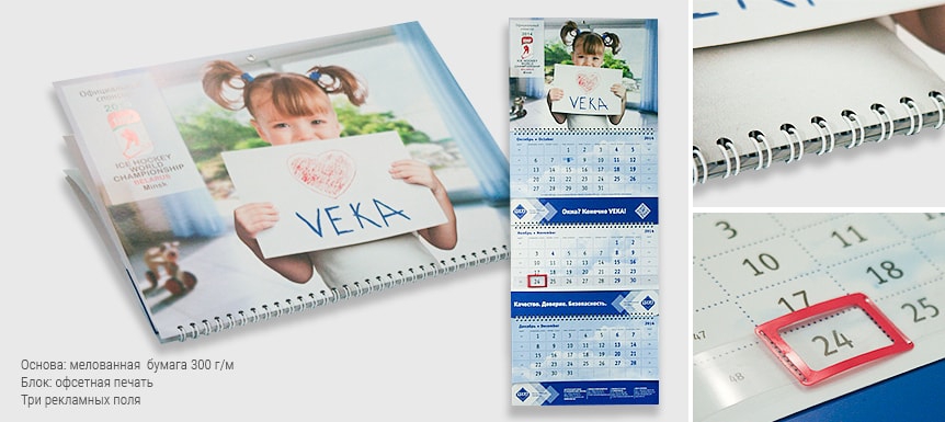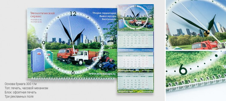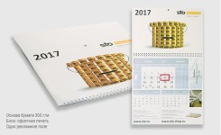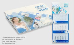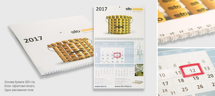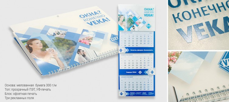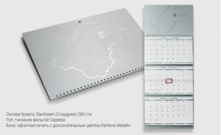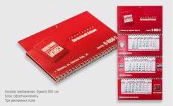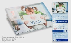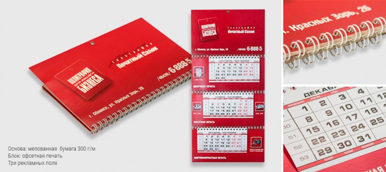 Настенные календари бывают квартальные, т.е. состоят из блоков, и перекидные. Изготавливаются на плотной основе, обычно это мелованная бумага 300 г/м. Если перекидной блок один, то и рекламное поле одно - внизу календаря, если перекидных блока три, то и рекламных полей тоже три. Топ календаря может оформляться нестандартно, например включать часовой механизм со стрелками, фигурную вырубку, тинение фольгой, может быть изготовлен из дизайнерской бумаги или даже пластика.