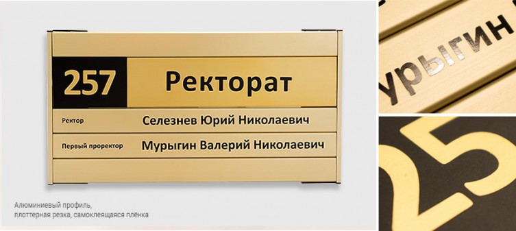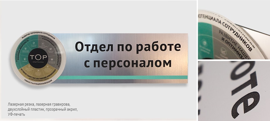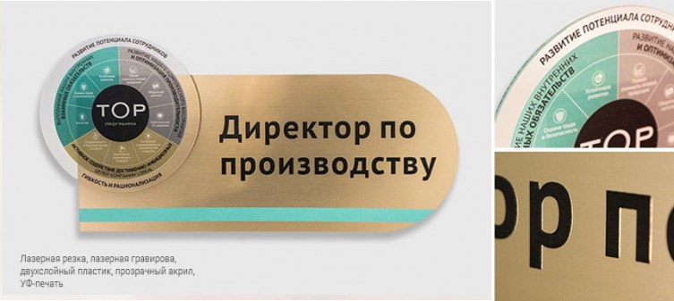 Разнообразные таблички и указатели - это яркие представители навигации в помещении или вне его. Технологии изготовления могут быть различны: уф-печать, лазерная резка или гравировка, сублимация или накатка самолеящейся плёнки.