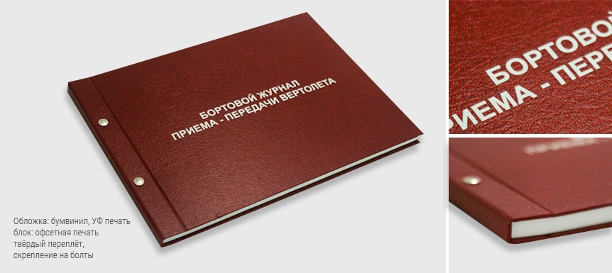 Разнообразные журналы регистрации, книги учёта или отзывов в твёрдом переплёте на болтах часто востребованы на производстве, в офисе или торговой точке. Обложка таких изделий обычно выполнена из прочного водостойкого бумвинила с нанесением текстов при помощи УФ-печати.